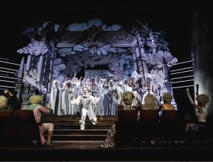 Dazu entwickelt Christophe Ouvrard ein Bühnenbild für das Spiel in zwei Welten und legt für die Figaro-Szenen eine ans Barock-Theater angelehnte Kulisse über die Geisterrunde.