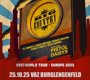 Wenn fünf Schotten rocken nennt man das einen Schottenrock. Den gab es dann am 25. Oktober von Big Country im leider nur schmal gefüllten VAZ Pfarrheim in Burglengenfeld auf die Ohren des enthusiastischen Publikums. Die Band ließ sich dennoch nicht lumpen und offerierte ein gut 100 minütiges ‚Best of‘ Set, welches die wichtigsten frühen Stationen beleuchtete und Songs der Alben „The Crossing“ (6x), „Steeltown“, „The Seer“, „No Place like home “ und „Buffalo Skinners (je 2) beinhaltete. Auch wenn von der Urbesetzung nur noch Gitarrist Bruce Watson übrig ist, der mich ein ums andere Mal an einen verpeilten Keith Richards in seinem Habitus erinnerte, und neu Sänger Tommy Paxton, normal Sänger der Tribute Band Restless Natives, nicht ganz die Stimme von Stuart Adamson besitzt, macht das Ganze schon Spass. Ordentlich Wumms mit drei Gitarren, Bass und Drums und kernige Lautstärke unterfütterten Klassiker wie „Look away“, „The Seer“, „In a big Country“, „Wonderland“, „Porrohman“ usw. genauso wie Deep Cuts wie die selten gespielten „Tall Ships go“, „Restless Native“, „Driving to Damascus“ (der aktuellste Song in der Setlist) sowie dem neuen Song „Eastworld“, welcher aktuell bei der Tour vorgestellt wird. (Warum siehe weiter hinten in der Kritik.) Zwei balladeske Nummern „Ships“ und „Chance“ mit extra langem Mitsingteil sorgten für etwas Verschnaufpause für die Ohren und die Ankündigung, dass das neue Album „Eastworld“ (das erste seit 13 Jahren, dann nach „The Journey“, fertig ist und 2026 veröffentlicht wird, sorgte für Jubel. Ich hätte noch mehr gejubelt, wenn man auch noch das Album „Peace in our Time“ mit dem Titelsong, „King of Emotion“ oder „Broken Heart“ bedacht hätte und vielleicht noch „One great Thing“ und „Just a Shadow“ mit in die Setlist integriert hätte. Aber dann wären wir bei 2 Stunden gewesen. Sehr schöner Auftritt und wieder eine Band abgehakt. Im Vorprogramm mühten sich die Glasgower Pistol Daisys redlich und gefielen mir, und dem noch überschaubareren Publikum, mit Musik á la Larkin Poe usw. – schade, dass der Bass und einiges andere von Band kam und Belly mit Stimmproblemen zu kämpfen hatte. An den Ansagen sollte man auch noch etwas arbeiten, denn die kamen arg schüchtern und leicht krampfig rüber. Aber ihr Indie Rock-Pop-Americana Mix kam sonst gut rüber und ich hab schon schlechteres als Vorband gesehen. Könnte was werden. (HJH)
