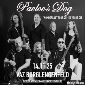 Georg Ringsgwandl stellte kürzlich bei einem Interview die Gegenfrage an mich, ob es Livemusik wie wir sie heute kennen, in fünf oder zehn Jahren überhaupt noch so geben wird. Zumindest war es dann ein Glücksfall mit PAVLOV’s DOG im VAZ Burglengenfeld nochmals eine Band erlebt zu haben, bei der Musik noch Facetten hat, Ebenen, zwischen denen sich Harmonien und Gefühle bewegen und wandern können. Die Band aus St. Louis/Missouri gibt es – mit Unterbrechungen – über ein halbes Jahrhundert. Aber David Surkamp mit seinem prägnanten Falsett ist noch immer ein agiler Kristallisationsknoten, der geschickt weiß, wie er buchstäblich historisch zu nennende Prog-Rock-Klassiker mit den Songs des aktuellen Albums „Wonderlust“ so zu vermengen hat, dass ein homogenes Set daraus wird. Er und Geigerin Abbie Steiling sind auch die optischen Frontpunkte. Steiling wirbelt im Gegenlicht mit Geige und Mähne, dass ein schönes Bild nach dem anderen erwächst. Und David Surkamp bemerkt mal den Fokus der Kamera auf sich gerichtet und bedankt sich quasi mit einem kurzen Stippen an seiner Hutkrempe und einem Lächeln. Beides auch optische Kommunikationseckpunkte, die sich gleichsam in den Songs widerspiegeln. Der Auftritt hätte durchaus mehr Publikum verdient gehabt! Gerne auch Jüngeres! Aber auf dem Parkplatz waren auch etliche Autos mit tschechischen Kennzeichen, die um den Schatz wussten und dafür belohnt wurden, dass sie die Kilometer gefressen hatten. (Bernd Schweinar)