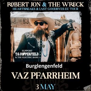 Robert Jon & The Wreck kommen aus Südkalifornien aus und preschten 2015 mit ihrem Debüt „Glory Bound“ wie aus dem Nichts in den Kreis der neuen, jungen Southern Rock-Bands. „We travel the nation, drink whiskey and play the music we love.“ So beschreiben sich die fünf bärtigen Herren aus Southern California selbst und legen seitdem Album für Album ein weiteres wunderbar ballerndes Stück Musik ohne Schnörkel auf den Plattenteller – zuletzt erschien im Spätsommer 2025 der Longplayer „Heartbreaks & Last Goodbyes“. Die Band stand auch bereits bei uns auf der Bühne, und rockte zuletzt den „Airport“ in Obertraubling, jetzt kommt sie wieder, diesmal ins VAZ in Burglengenfeld. War dieses Quintett zu Beginn noch der absolute Geheimtipp, hat sich das im Laufe der Jahre komplett geändert und jetzt ist sich die Band des Erbes von alten Klassikern wie Lynyrd Skynyrd, Santana, den Eagles, Doobie Brothers, Little Feat oder den Allman Brothers – um nur einige wenige zu nennen – voll bewusst. Die Band hat mittlerweile ihren eigenen zeitgemäßen Sound entwickelt, der sich auf jeder Bühne in einer ungeheuren Kraft entlädt. Mit herausragenden Songs, mitreißenden Gitarrensoli und reichhaltigen Gesangsharmonien hat die Band das Publikum weltweit mit ausverkauften Konzerten begeistert – das dürfte für ein volles VAZ sorgen! Als Support ist T.G. Copperfield & The Electric Band dabei – die ideale Ergänzung.