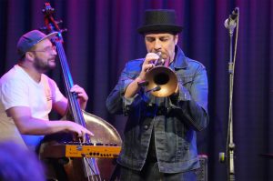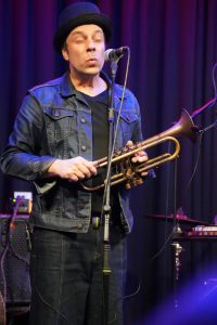 Der Trompeter Joo Kraus gastierte mit seinem Quartett im Regensburger Jazzclub Leerer Beutel. Mit seinem prächtig groovenden, sogar clubtauglichen Sound spricht der Trompeter, Sänger, Keyboarder und Komponist schon immer eine generationenübergreifende hellauf begeisterte Zuhörerschaft an. Seine Songs wie „Surfin` at Night“ oder schlicht „Chaka Boom (Tic Toc)“ interpretiert er meist in einem Sprechgesang, der am Rap-Idiom andockt. Das hat er bereits vor Jahrzehnten im Duo mit dem Kraan-Bassisten Helmut Hattler gemacht. Tab Two nannten sie ihr Jazz-Rap-Duo, mit dem sie auch in Regensburg gastierten und das lange als das erfolgreichste Duo des deutschen Jazz galt. Seit der Auflösung von Tab Two und einer kurzen Reunion für ein Releasekonzert eines weiteren Albums ist Kraus vor allem mit eigenem Quartett unterwegs. In der Besetzung mit den beiden Stuttgartern Veit Hübner am Kontrabass – gelegentlich auch Keyboards – und Torsten Krill am knackig wummernden Schlagzeug und dem elektrisierenden Gitarristen Jo Ambros hat er vor zwei Jahren das Album „No Excuse“ veröffentlicht. Aus dieser „musikalisch bunten Tüte, dem Briefmarken-Sammelalbum“, wie es zu recht auf Online-Plattformen beworben wird, stellte er Songs wie das poppige „Hope“, das mystisch-dunkle Titelstück und „Crying in Your Sleep“ vor.