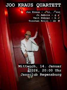 Der Trompeter Joo Kraus gastierte mit seinem Quartett im Regensburger Jazzclub Leerer Beutel. Mit seinem prächtig groovenden, sogar clubtauglichen Sound spricht der Trompeter, Sänger, Keyboarder und Komponist schon immer eine generationenübergreifende hellauf begeisterte Zuhörerschaft an. Seine Songs wie „Surfin` at Night“ oder schlicht „Chaka Boom (Tic Toc)“ interpretiert er meist in einem Sprechgesang, der am Rap-Idiom andockt. Das hat er bereits vor Jahrzehnten im Duo mit dem Kraan-Bassisten Helmut Hattler gemacht. Tab Two nannten sie ihr Jazz-Rap-Duo, mit dem sie auch in Regensburg gastierten und das lange als das erfolgreichste Duo des deutschen Jazz galt. Seit der Auflösung von Tab Two und einer kurzen Reunion für ein Releasekonzert eines weiteren Albums ist Kraus vor allem mit eigenem Quartett unterwegs. In der Besetzung mit den beiden Stuttgartern Veit Hübner am Kontrabass – gelegentlich auch Keyboards – und Torsten Krill am knackig wummernden Schlagzeug und dem elektrisierenden Gitarristen Jo Ambros hat er vor zwei Jahren das Album „No Excuse“ veröffentlicht. Aus dieser „musikalisch bunten Tüte, dem Briefmarken-Sammelalbum“, wie es zu recht auf Online-Plattformen beworben wird, stellte er Songs wie das poppige „Hope“, das mystisch-dunkle Titelstück und „Crying in Your Sleep“ vor.