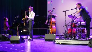 Musik, bei der man eigentlich keine Stühle im Saal bräuchte und die zum Tanzen animiert, auch die gab es bei dieser Festivalausgabe zu hören. Dafür zuständig: der britische Sänger und Pianist Reuben James, ein Natural Born Entertainer, wie sich rasch feststellen ließ Denn der Mann kann ein Publikum auf ganz natürliche Weise und ohne dabei zu überziehen elektrisieren. James hat Charme und bekommt seine Stimme bis rauf ins Falsett in seinem süffigen, jazzigen Mix aus Soul, R&B, Reggau und HipHop. Und er hat mit dem Hamburger Silvan Strauss den richtigen Mann am Schlagzeug in seinem Quartett. Strauss pusht die Musik ordentlich mit seinen Drum-Beats. Reuben James selbst versprüht dazu die ganze Zeit eine fröhliche, unweigerlich Gute Laune machende Energie. Was für eine verführerische Mischung, die am Ende auch noch mit einer kurzen Hommage an den großen, im letzten Jahr verstorbenen US-Vibrafonisten Roy Ayers überraschte.
