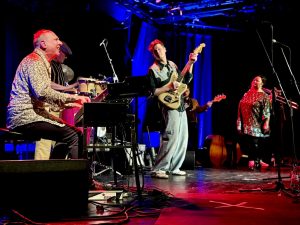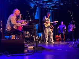 Sie eröffnen mit „I meet you in my Dream“ – einem Song aus jenen Tagen, als Norbert Schneider noch englischsprachig versuchte, die Karriereleiter emporzuklettern. Und leiten dann über zum programmatischen „Immer schee draubleim“, einer in balkaneskem New Orleans-Style daherkommenden Up-tempo-Nummer, die all den Ehrgeiz und die Motivation des Bandleaders in dem Satz „Aufstehen hat sich noch ollaweil auszahlt“ zusammenfasst. Was bislang noch gar nicht erwähnt wurde: Zum einen ist die Band ganz formidabel, in der an diesem Abend mit Roland Guggenbichler ein Kurt Ostbahn-Veteran an der Hammond-Orgel sitzt. Hinzu kommt, dass sich Norbert Schneider mit Alexander Horstmann und Tini Kainrath zwei Backgroundsänger leistet, die gerade dann in Vielstimmigkeit glänzen, wenn das Ensemble jene Gospeltöne anschlägt, die auf dem 2023er Album „Ois paletti“ in den Fokus gerückt waren. Ganz neu – jedenfalls für den aus Regensburg angereisten Gast – im Programm ist das gleichermaßen zeitdiagnostische wie mitreißende „Feuer am Dach“. Darin wird die Sehnsucht nach einer ordnenden Hand für diese chaotische Welt, die zuletzt beim Gospel noch angeklungen war, beantwortet mit dem Satz: „Da Herrgott is in Urlaub gfahrn!“. Tja, so schaut’s aus, an diesem Abend auf dieser Bühne, die das Weltgeschehen in unmittelbarer Nachbarschaft zur Sicherheitskonferenz und zur Riesendemo gegen das Mullah-Regime in authentischer Weise thematisiert – und dabei doch nicht abdriftet in grenzenlosen Pessimismus. Sondern emotional dagegenhält, mit den Heilkräften dieser Melange, die zuletzt in der „Süddeutschen Zeitung“ als „Riesenrad-Blues“ bezeichnet wurde. Ein Bild, das deshalb einleuchtet, weil diese den Prater (und seine circensischen Gegenwelten) herbeizitierende Vorstellung die Akrobatik des Gitarrenvirtuosen Norbert Schneider betont wie auch die Tatsache, dass er mit seiner Band an den ganz großen musikalischen Rädern dreht. Was im Übrigen gerade darin gipfelt, dass er mit seiner aktuellen Instrumental-LP „Guitar speaks“ auf Platz 9 der Austrian Artist Charts in der Kategorie „Longplayer“ rangiert. Ein Wunder? Ja, logisch! Das hoffentlich bald wieder in Regensburg Station macht! Und zwar vor ganz viel Publikum! (Peter Geigeer – Text/Fotos)