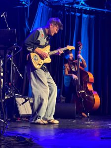 Sie eröffnen mit „I meet you in my Dream“ – einem Song aus jenen Tagen, als Norbert Schneider noch englischsprachig versuchte, die Karriereleiter emporzuklettern. Und leiten dann über zum programmatischen „Immer schee draubleim“, einer in balkaneskem New Orleans-Style daherkommenden Up-tempo-Nummer, die all den Ehrgeiz und die Motivation des Bandleaders in dem Satz „Aufstehen hat sich noch ollaweil auszahlt“ zusammenfasst. Was bislang noch gar nicht erwähnt wurde: Zum einen ist die Band ganz formidabel, in der an diesem Abend mit Roland Guggenbichler ein Kurt Ostbahn-Veteran an der Hammond-Orgel sitzt. Hinzu kommt, dass sich Norbert Schneider mit Alexander Horstmann und Tini Kainrath zwei Backgroundsänger leistet, die gerade dann in Vielstimmigkeit glänzen, wenn das Ensemble jene Gospeltöne anschlägt, die auf dem 2023er Album „Ois paletti“ in den Fokus gerückt waren. Ganz neu – jedenfalls für den aus Regensburg angereisten Gast – im Programm ist das gleichermaßen zeitdiagnostische wie mitreißende „Feuer am Dach“. Darin wird die Sehnsucht nach einer ordnenden Hand für diese chaotische Welt, die zuletzt beim Gospel noch angeklungen war, beantwortet mit dem Satz: „Da Herrgott is in Urlaub gfahrn!“. Tja, so schaut’s aus, an diesem Abend auf dieser Bühne, die das Weltgeschehen in unmittelbarer Nachbarschaft zur Sicherheitskonferenz und zur Riesendemo gegen das Mullah-Regime in authentischer Weise thematisiert – und dabei doch nicht abdriftet in grenzenlosen Pessimismus. Sondern emotional dagegenhält, mit den Heilkräften dieser Melange, die zuletzt in der „Süddeutschen Zeitung“ als „Riesenrad-Blues“ bezeichnet wurde. Ein Bild, das deshalb einleuchtet, weil diese den Prater (und seine circensischen Gegenwelten) herbeizitierende Vorstellung die Akrobatik des Gitarrenvirtuosen Norbert Schneider betont wie auch die Tatsache, dass er mit seiner Band an den ganz großen musikalischen Rädern dreht. Was im Übrigen gerade darin gipfelt, dass er mit seiner aktuellen Instrumental-LP „Guitar speaks“ auf Platz 9 der Austrian Artist Charts in der Kategorie „Longplayer“ rangiert. Ein Wunder? Ja, logisch! Das hoffentlich bald wieder in Regensburg Station macht! Und zwar vor ganz viel Publikum! (Peter Geigeer – Text/Fotos)