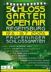 Kein Zirkuszelt-Flair mehr, dafür eine lauschige Atmosphäre im Prüfeninger Schlossgarten mit der bewährten Mischung aus stimmungsvollen Konzerten und Kabarett-Highlights. Das ist das neue Schlossgarten-Open Air-Festival von Alex Bolland, das im Juni 2024 Premiere feierte als Nachfolger für das Zelt-Festival in Lappersdorf. Festival-tauglich wurde dieser wunderschöne alte Biergarten mit seinem markanten alten Baumbestand bereits 2021 gemacht, als gezwungenermaßen corona-bedingt Alex Bolland seine Zeltfestival-Veranstaltungen ins Freie verlegen musste und der Großteil dann eben im Prüfeninger Schlossgarten stattfand. Gemeinsam mit der Crew des Schlossgartens wurde quasi aus dem Nichts eine stimmungsvolle Festival-Logistik installiert. Nach dem großen Erfolg der Festivals 2024 und 2025 geht es 2026 weiter. Und auch das diesjährige Festival-Programm im Prüfeninger Schlossgarten hat es wieder in sich. Vielseitig, virtuos, höchst unterhaltsam und mitreißend – da ist wieder für jeden was dabei.